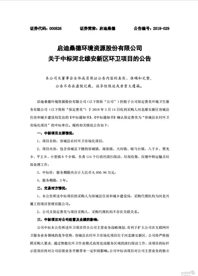3月15日,启迪桑德发布公告,公司控股子公司保定善美环境卫生服务有限公司(以下简称“保定善美”)于2018年3月14日收到采购人河北雄安新区容城县住房和城乡建设局发出的《中标通知书》,《中标通知书》确认保定善美为“容城县农村环卫市场化项目”的中标单位。