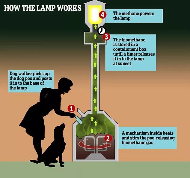 遛狗人将狗粪放进收集装置后,要拉下把手。狗粪在厌氧消化器中加热和混合时释放生物甲烷,从而产生电力来为路灯供能。实际上将粪便变废为宝从新石器时代就已有了,那时人们利用排泄物作为肥料。在西方发达国家,从动物粪便和人类污水中提取热量和电力的工厂很普遍。